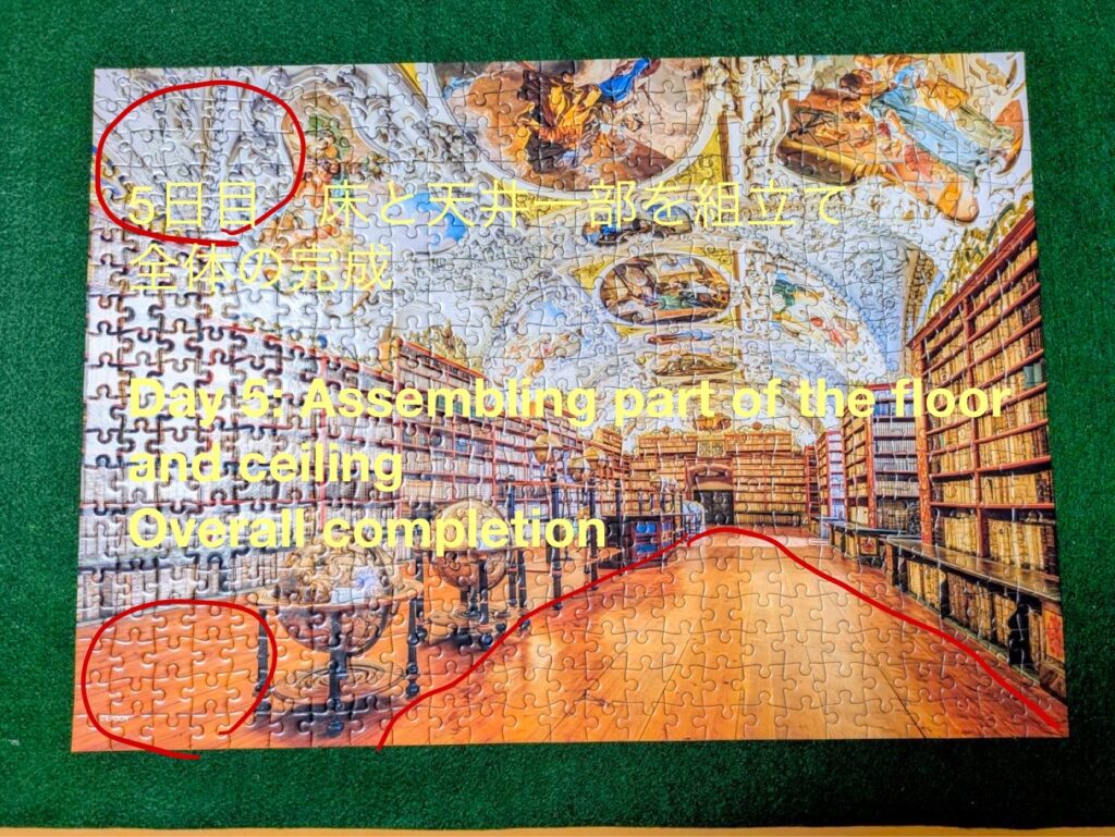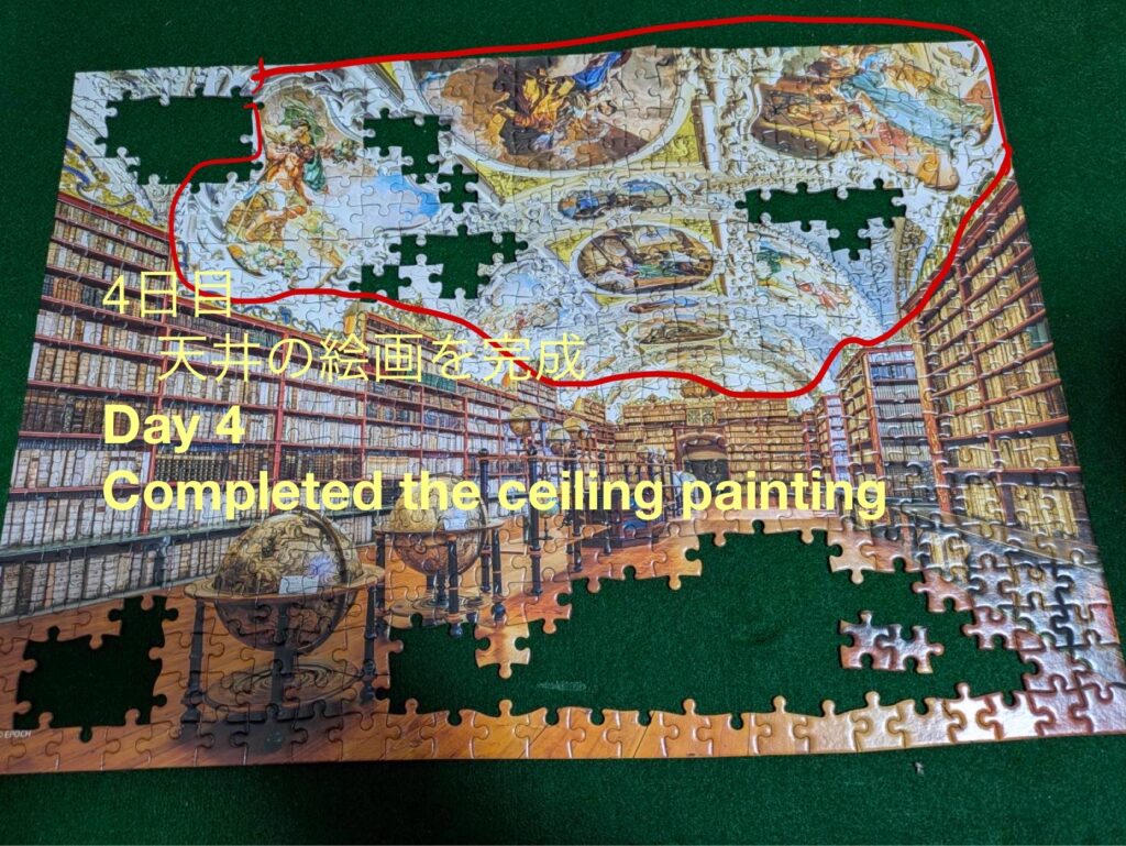 天井も同様です。天井に絵が書かれているので、まずはそれぞれの絵を組み立てていき、最後くっつけるようなしました。