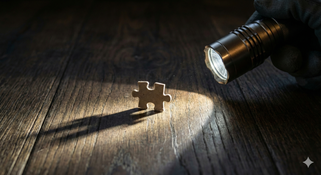 - 「境界線の外」を疑う: 人間の脳は「パズル盤面」に集中しすぎるため、視覚的な盲点(スコトーマ)が生じます。作業机の脚の隙間、衣類の袖の中、ペットの毛の中など、「ありえない場所」を機械的にチェックしましょう。